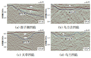 上构造层主体为侏罗系—白垩系,其中上侏罗统和上白垩统大面积遭受剥蚀,形成了北东向展布的凸凹相间格局。中生代盆地由6个坳陷和5个隆起构成[16],其中6个坳陷可以进一步分为31个凹陷和25个凸起(图 2)。中生界在洪格尔吉山和宗乃山等隆起高部位剥蚀殆尽,隆起低部位局部残留侏罗系或白垩系,其中坳陷内的凸起主要发育上白垩统乌兰苏海组,而凹陷则主要发育侏罗系和下白垩统,主体为下白垩统巴音戈壁组、苏红图组和银根组[17]。