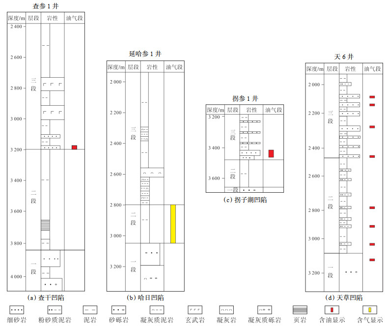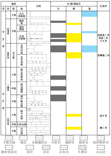 银额盆地内多套地层钻遇油气,油气主要来自下白垩统巴音戈壁组湖相泥岩、泥页岩和侏罗系湖相泥岩和页岩,其中侏罗系仅在盆地西北和东南区域的凹陷内分布。白垩系发育主要含油气组合,相带主要为河流—冲洪积相、三角洲相和湖相,岩性为砂砾岩,灰黑色泥岩,泥质粉砂岩和中基性安山岩、玄武岩,下白垩统巴音戈壁组发育深湖相灰色、黑色泥岩和泥页岩烃源岩,是发现油气的主要层系。侏罗系主要发育冲积扇、河流相,向湖盆中心过渡为湖沼和湖泊相,岩性主要为灰绿色砾岩、粗砂岩夹炭质页岩、煤层以及黑色泥岩和页岩(图 3)。需要指出的是,盆地内的白垩系巴音戈壁组和侏罗系有学者认为是二叠系。