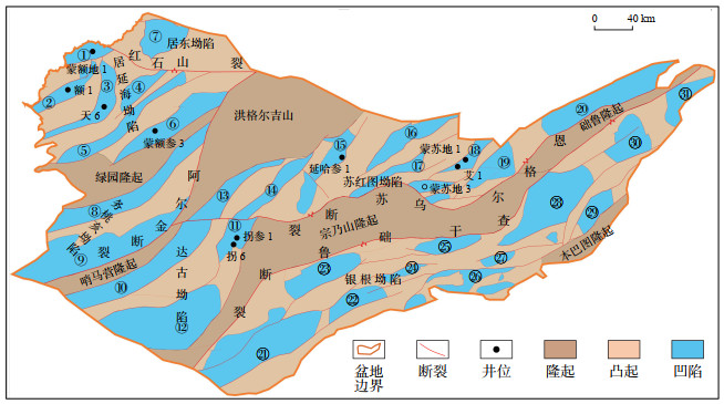 (3) 银额盆地现今结构由中生代和前中生代2个构造层构成,中生代构造层发育断陷盆地,前中生代构造层表现为褶皱造山带。中生代断陷盆地包含6个坳陷和5个隆起,其中6个坳陷由31个凹陷和25个凸起构成,油气资源分布在凹陷内,凹陷总面积占比40.5%,面积较大、埋深越深的凹陷油气资源前景较好。