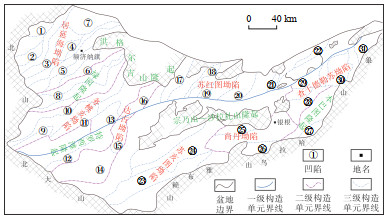 下载原图 图 2 银额盆地中生代构造单元划分 注: ①. 乌珠尔凹陷; ②. 路井凹陷; ③. 天草凹陷; ④. 建国营凹陷; ⑤. 格朗乌苏凹陷; ⑥. 吉格达凹陷; ⑦. 居东凹陷; ⑧. 哨马营凹陷; ⑨. 湖西新村凹陷; ⑩. 特洛西滩凹陷; ⑪. 拐子湖凹陷; ⑫. 芨芨海子凹陷; ⑬. 拐子湖西凹陷; ⑭. 温图高勒凹陷; ⑮. 哈日凹陷; ⑯. 巴北凹陷; ⑰. 乌兰凹陷; ⑱. 艾西凹陷; ⑲. 艾东凹陷; ⑳. 迈马凹陷; ㉑. 锡勒凹陷; ㉒. 锡勒东凹陷; ㉓. 因格井凹陷; ㉔. 树槐头南凹陷; ㉕. 乌力吉凹陷; ㉖. 托莱凹陷; ㉗. 巴彦南凹陷; ㉘. 莫林凹陷; ㉙. 阿木凹陷; ㉚. 查干凹陷; ㉛. 白云凹陷。 Fig. 2 Mesozoic tectonic units division of Yin'e Basin |