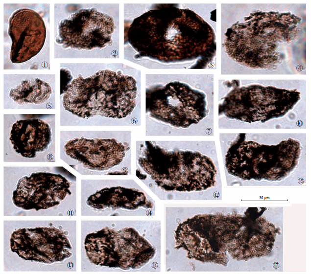 下载原图 图 8 银额盆地苏红图坳陷艾西凹陷蒙苏地1井晚二叠世孢粉化石 注: ①. 2 720 m,中大光面单缝孢Laevigatosporites medius Kosanke,1950;②—④和⑦. 2 697~2 719 m,弗氏粉(未定多种)Florinites spp.; ⑤. 2 695 m,苍白开通粉Vitreisporites pallidus(Reissinger)Nilsson,1958;⑥. 2 719 m,四方十字粉Crucisaccites quadratoides(Zhou) Hou and Song,1995;⑧⑨⑬. 2 697~2 725 m,聚囊粉(未定多种)Vesicaspora spp.; ⑩. 2 697 m,冷杉型多肋粉(未定种)Striatoabieites sp.; ⑪. 2 725 m,叉肋粉(未定种)Vittatina sp.; ⑫. 2 697 m,葵鳞羊齿粉(未定种)Pteruchipollenites sp.; ⑭和⑯. 2 697 m,松型粉(未定种) Pityosporites sp.; ⑮. 2 697 m,蝶囊粉(未定种)Platysaccus sp.; ⑰.2 697 m,逆沟粉(未定种)Anticapipollis sp.。 Fig. 8 Late Permian sporopollen fossils from well Mengsudi-1 in Aisi Sag, Suhongtu Depression, Yin'e Basin |