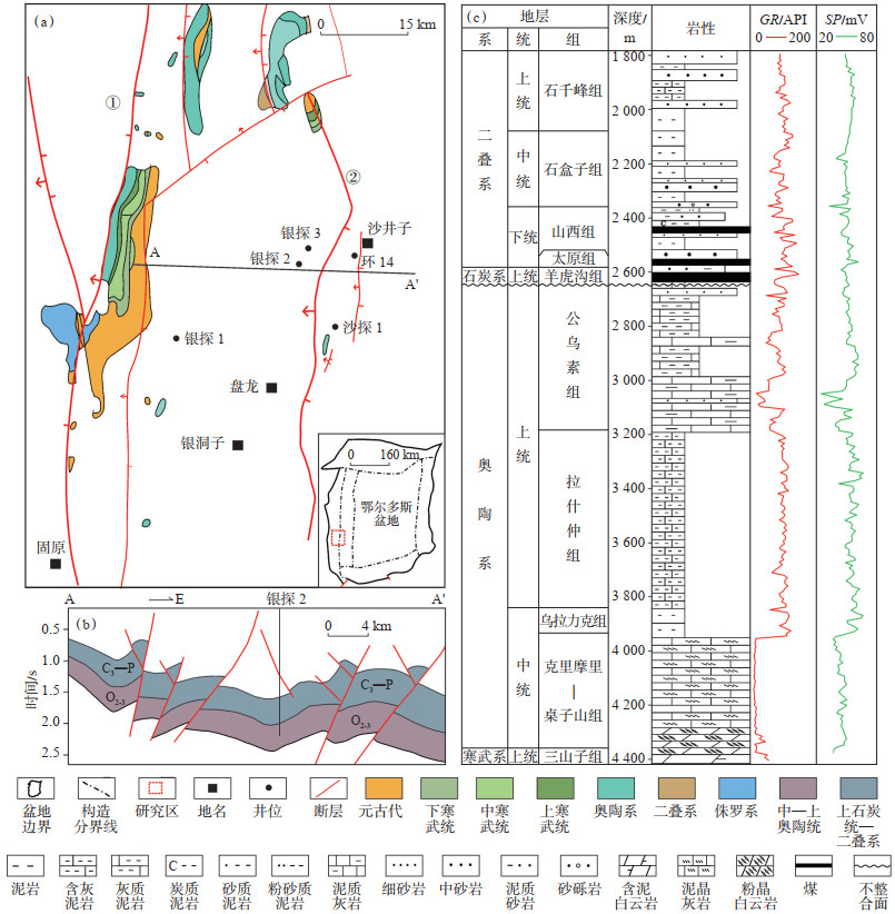 沙井子地区位于鄂尔多斯盆地西缘中段,距离盆地沉积中心较远,在构造上横跨西缘冲断带和天环坳陷,西面以青铜峡—固原断裂为界,东临环县,北抵沙井子镇,南至银洞子,面积约1.6×103 km3 (图 1a)。早古生代以来,沙井子地区经历了加里东期、印支—海西期、燕山期和喜马拉雅期的构造运动,构造极其复杂。研究区自西向东延伸的逆冲断裂逐渐扩展,且南北方向上的大型逆冲断裂被东西方向的断层分割,从而形成了多个小型构造区域,东西方向的断层多表现为右行走滑特征,具有调节断层的特征[6](图 1a,1b)。银探2井位于沙井子镇西南方向约10 km处,临近惠安堡—沙井子断裂,自下而上发育下古生界奥陶系(中、上奥陶统部分缺失)以及上古生界石炭系(中、下石炭统缺失)(图 1c)。加里东运动时期,盆地西缘发生裂陷,发育缺氧还原环境下的深水斜坡-盆地相沉积[10],且奥陶系厚度大,有利于烃源岩形成。目的层奥陶系乌拉力克组厚度约96 m,钻井过程中有明显的气测显示。