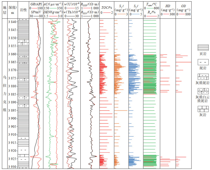 鄂尔多斯盆地西缘乌拉力克组泥页岩被认为是该地区海相地层中最优质的烃源岩之一,厚度较大,且富含有机物。银探2井乌拉力克组在3 887~3 922 m井段,TOC为1.0%~1.54%(参见表 1),岩石热解峰温(Tmax)为379~463 ℃,处于高成熟度阶段; 在3838~3 887 m和3922~3 932 m井段,TOC均小于1.0%,Tmax为440~466 ℃,Ro为0.70%~1.41%,处于高成熟—过成熟阶段,热解吸附烃(S1)为0.10~2.31 mg/g,干酪根热解烃(S2)为0.05~4.01 mg/g (图 10),生烃潜量(S1+S2)最高达到5.63 mg/g,整体生烃潜力较好。四川盆地五峰组—龙马溪组页岩TOC平均为3.5%[39],美国的五大含气页岩TOC总体为0.50%~25.00%,其中Barnett页岩TOC为2.0%~7.0 %[40]。相比之下,位于鄂尔多斯盆地西缘的乌拉力克组泥页岩的有机质含量较低,被认为是品质相对较差的海相烃源岩层。