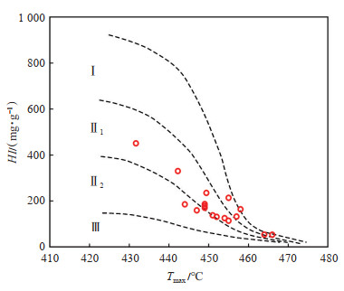 下载原图 图 11 鄂尔多斯盆地西缘银探2井奥陶系乌拉力克组页岩HI-Tmax交会图(据文献[42]修改) Fig. 11 HI-Tmax values for shales from Ordovician Wulalike Formation in well Yintan 2, western margin of Ordos Basin |