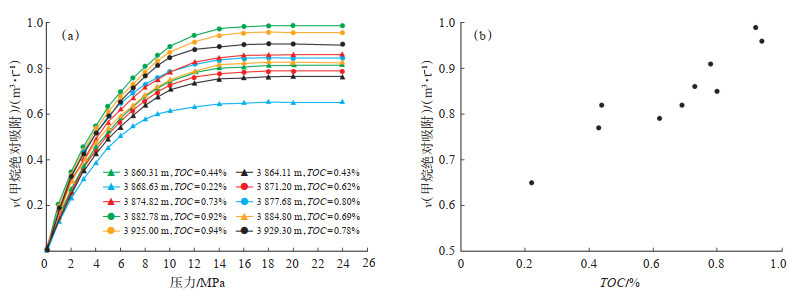 甲烷等温吸附实验可测定页岩在某一特定温度条件下的最大甲烷吸附量,从而反映出页岩的最大气体吸附能力,采用德国Rubotherm公司制造的ISOSORP-HP Ⅱ Static型磁悬浮天平重量法高压等温吸附仪,对页岩的甲烷吸附能力进行测量和分析。在30 ℃实验条件下,乌拉力克组页岩甲烷绝对吸附曲线在15~16 MPa时渐近饱和,甲烷最大吸附质量体积为0.65~0.99 m3/t,且最大吸附量和TOC含量呈明显的正相关关系(图 12)。银探2井乌拉力克组总含气量(质量体积为0~3.40 m3/t)明显低于四川盆地五峰组—龙马溪组含气量(质量体积为0.44~5.19 m3/t)[14],但高于美国泥页岩含气量底限(质量体积为0.50~1.00 m3/t)[46-47],表明研究区乌拉力克组泥页岩仍具有一定的页岩气勘探潜力。