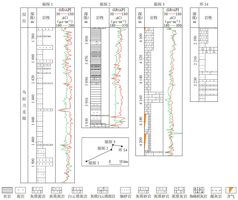 从鄂尔多斯盆地西缘沙井子地区4口主要探井的连井剖面可以看出,乌拉力克组页岩分布稳定,且厚度较大(图 13)。银探2井乌拉力克组页岩TOC大于1.0%的地层厚度大于30 m; 银探3井黑色泥页岩累计厚度约140 m,含气页岩厚度大于90 m,远大于四川盆地和美国主要典型页岩(表 2)。对比银探2井乌拉力克组页岩、四川盆地和美国主要典型页岩储层的特征参数,沙井子地区页岩虽然TOC含量和含气量相对均较低,但页岩厚度大,处于生烃高峰期,地层脆性矿物含量高,地层渗透率相对较高,有利于后期的工业化开采。整体来看,盆地西缘沙井子地区乌拉力克组具有较好的页岩气勘探潜力。