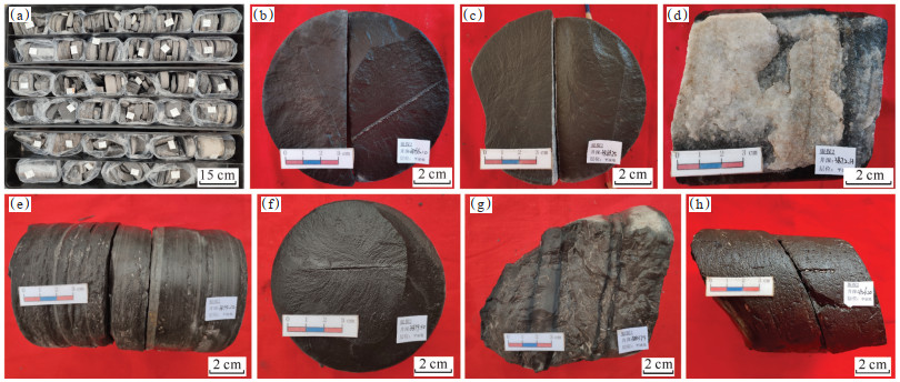 下载原图 图 2 鄂尔多斯盆地西缘银探2井奥陶系乌拉力克组泥页岩典型照片 (a)黑灰色页岩,页理较为发育,3 879.95~3 884.90 m; (b)黑灰色泥页岩,层理发育,可见笔石和裂缝,3 866.10 m; (c)黑色页岩,裂缝充填方解石,3 869.75 m; (d)黑色页岩,近垂直裂缝被方解石充填,3 872.13 m; (e)灰褐色页岩,层理发育,夹灰色灰岩条带,3 879.02 m; (f)黑色页岩,发育笔石,3 879.50 m; (g)灰黑色含白云质泥岩,3 883.73 m; (h)灰黑色页岩,层理发育,可见高角度裂缝,3 926.20 m。 Fig. 2 Photographs of mudstone and shale from Ordovician Wulalike Formation in well Yintan 2, western margin of Ordos Basin |