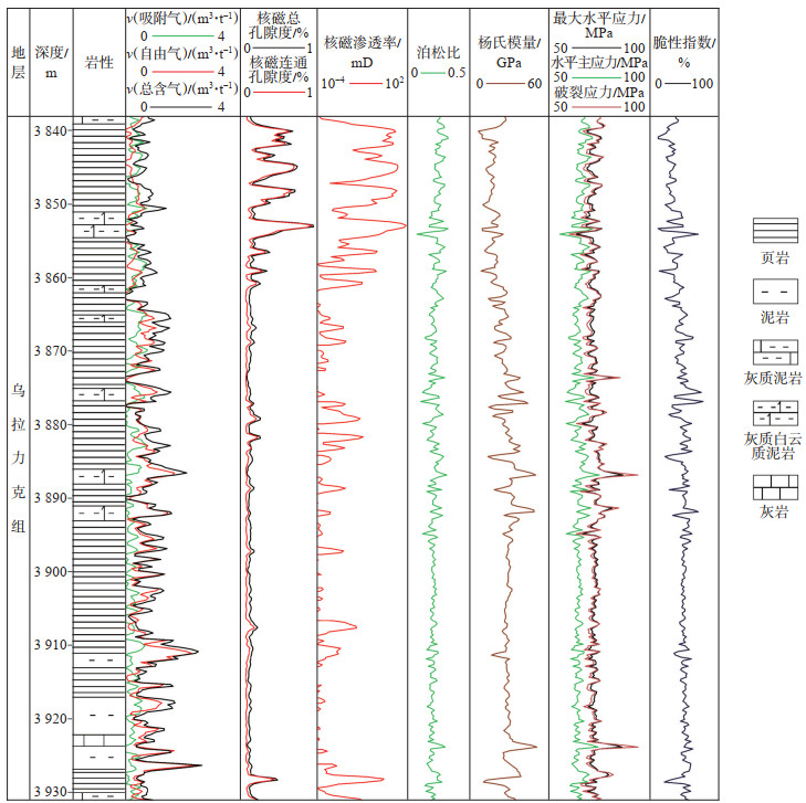 (1) 鄂尔多斯盆地西缘银探2井乌拉力克组岩性主要为黑色页岩、黑色泥岩以及灰黑色云质泥岩的组合,页岩层理发育,累计厚度约78.9 m,矿物组成以石英为主,其次包含黏土和碳酸盐矿物,而长石的含量相对较少,脆性矿物质量分数为70.98%~90.32%,脆性指数为50.03%~71.16%,有利于后期储层的压裂改造。