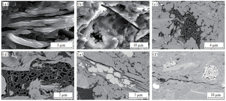 下载原图 图 5 鄂尔多斯盆地西缘银探2井奥陶系乌拉力克组泥页岩微观孔隙特征 (a)云母片层间缝隙,3 860.30 m; (b)少量微裂隙及溶蚀微孔,3 875.60 m; (c)页岩有机质孔,3 880.80 m; (d)页岩有机质孔,3 927.52 m; (e)碎屑颗粒与黏土矿物间贴粒缝和页岩有机质孔,3 880.80 m; (f)微裂缝和黄铁矿晶体以及黄铁矿晶间孔,3 927.52 m。 Fig. 5 Microscopic pore characteristics of mud shale from Ordovician Wulalike Formation in well Yintan 2, western margin of Ordos Basin |
