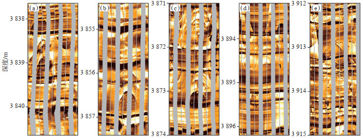 下载原图 图 6 鄂尔多斯盆地西缘银探2井奥陶系乌拉力克组成像测井裂缝特征 (a)高角度裂缝,可见页岩层理,3 876.6~3 840.6 m; (b)可见有机裂缝和高角度裂缝,3 854.4~3 857.4 m; (c)发育密集高角度裂缝,页岩层理清晰,3 871.0~3 874.0 m; (d)可见清晰页岩层理,高角度裂缝发育,3 893.2~3 896.2 m; (e)页岩层理发育,有机裂缝和高角度裂缝均发育,3 912.0~3 915.0 m。 Fig. 6 Imaging logging fracture characteristics of Ordovician Wulalike Formation of well Yintan 2, western margin of Ordos Basin |