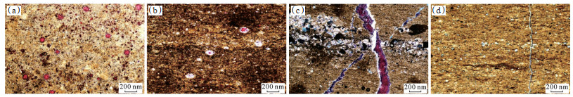 下载原图 图 7 鄂尔多斯盆地西缘银探2井奥陶系乌拉力克组泥页岩储集空间特征 (a)粒间溶孔,岩性致密,3 883.90 m;(b)粒内溶孔,具水平层理,岩性致密,3 884.52 m;(c)微裂缝,略具水平纹层,早期垂直纹层开启裂隙均被亮晶铁方解石充填,未被铸体充填的顺层裂隙是人为造成,整体岩性致密,3 926.36 m;(d)微裂缝,具水平层理,早期开启裂隙均被铁方解石充填,3 929.15 m。 Fig. 7 Reservoir space characteristics of mud shale from Ordovician Wulalike Formation in well Yintan 2, western margin of Ordos Basin |