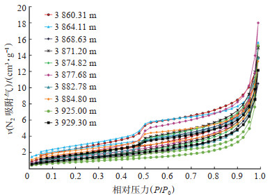 下载原图 图 8 鄂尔多斯盆地西缘银探2井奥陶系乌拉力克组泥页岩氮气吸附-脱附曲线 Fig. 8 N2 adsorption-desorption curves of Ordovician Wulalike Formation mud shale in well Yintan 2, western margin of Ordos Basin |