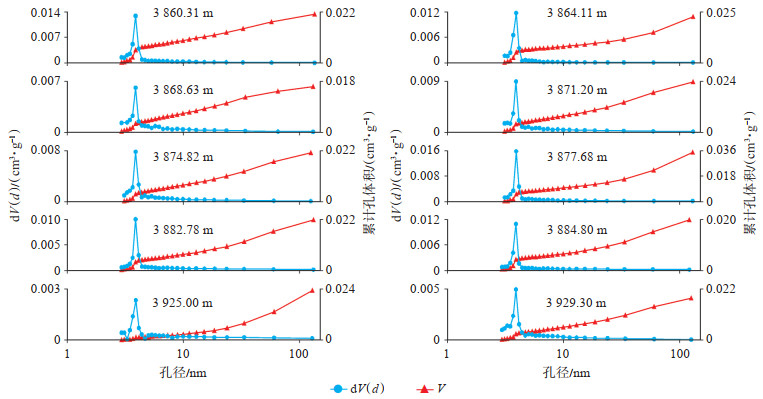 下载原图 图 9 鄂尔多斯盆地西缘银探2井乌拉力克组泥页岩N2吸附-脱附实验的孔径分布曲线 注: V为孔体积,cm3/g; dV(d)表示对应孔径(d)的体积增量,cm3/g。 Fig. 9 Pore size distribution curves from N2 adsorption-desorption experiments of Wulalike Formation mud shale in well Yintan 2, western margin of Ordos Basin |