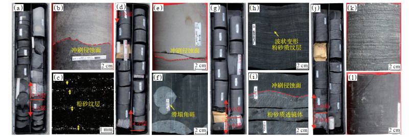 下载原图 图 3 四川盆地寒武系筇竹寺组4次快速海侵—缓慢海退沉积旋回典型岩性图 (a)1—2小层分界线,WY1H井,4 459.00~4 460.82 m;(b)风暴流、低密度冲刷侵蚀痕迹,2小层,WY1H井,4 445.23~4 445.51 m;(c)灰黑色页岩夹粉砂质纹层,Z201井,1小层,4 863.07 m;(d)3—4小层分界线,WY1H井,4 401.20~4 403.00 m;(e)灰白色粉砂岩,冲刷侵蚀面,4小层,Z201井,4 618.53~4 618.35 m;(f)滑塌透镜体,3小层,WY1H井,4 403.70~4 404.00 m;(g)5—6小层分界线,WY1H井,4 311.50~4 313.40 m;(h)纹层状粉砂岩,6小层,WY1H井,4 249.31~4 249.50 m;(i)灰黑色泥页岩,粉砂质透镜体,5小层,WY1H井,4 331 m;(j)7—8小层分界线,Z201井,4 458.08~4 459.71 m;(k)粉砂岩夹薄层页岩,8小层,Z201井,4 456.68 m;(l)灰黑色页岩,7小层,WY1H井,4 233.78~4 233.88 m。 Fig. 3 Typical lithologies of four rapid transgression-slow regression sedimentary cycles of Cambrian Qiongzhusi Formation, Sichuan Basin |