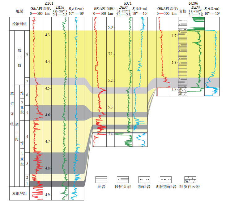 德阳—安岳裂陷槽槽内北段(SongT1井以北,图 1a)为深水区,属深水陆棚,该区域地层沉积稳定,裂陷槽内较大空间及深水环境(深水陆棚相)为筇竹寺组的沉积提供了相对稳定的沉积场所,使地层得以完整发育,裂陷槽的深水环境控制了高沉积速率与较厚地层的发育。此外,深水环境相对封闭,沉积物不容易被侵蚀,地层缺失现象罕见,岩性组合呈明显的旋回性,该区Z201井高GR层(1,3,5,7小层)发育深灰—灰黑色泥页岩夹灰白色(钙质) 粉砂岩为主,低GR层(2,4,6,8小层)发育粉砂岩、砂质页岩为主(图 2)。槽内北段筇竹寺组各小层均发育完整,地层厚度较大,均在600 m左右(Z201井为585.6 m)。