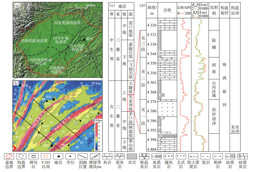川东二叠系自下而上发育梁山组、栖霞组、茅口组、吴家坪组和大隆组(与长兴组同期异相)(图 1c)。吴家坪组受中、晚二叠世东吴运动的影响,发生拉张活动导致地层下降,底部与下伏茅口组呈不整合或假整合接触[16],与上覆大隆组为整合接触。上覆大隆组为区域性灰岩或泥灰岩,下伏茅口组为区域性灰岩,整体上顶底板条件较好,对吴家坪组页岩气有较强的封隔能力。下二叠统吴家坪组自下而上可分为吴家坪组一段(吴一段)、吴家坪组二段(吴二段)、吴家坪组三段(吴三段),吴一段沉积环境为滨岸沼泽,主要发育泥岩、黏土质页岩以及玄武岩;吴二段下部为台内洼地沉积,发育灰黑色页岩以及少量炭质页岩,上部为斜坡相,主要发育灰岩、泥灰岩等;吴三段为深水陆棚相沉积,发育深黑色炭质页岩,硅质页岩(图 1d)。研究区位于“开江—梁平”海槽内,部分位于海槽边缘,整体上为一套深水陆棚相地层,在沉积时期经历了多次海侵、海退,相带变化快,深水环境下沉积了大套黑色页岩。