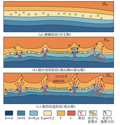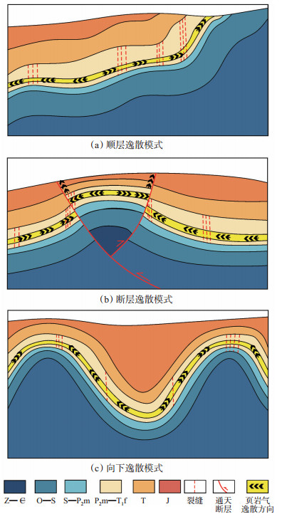 为清楚了解吴家坪组页岩气逸散的情况,对研究区页岩气的逸散情况进行了分析。通常情况下,页岩气的逸散分为3种模式:顺层逸散模式、断层逸散模式和向下逸散模式[19]。顺层逸散模式是页岩气顺层渗透率大于1.0×10-3 mD,由于页岩层系埋深较浅,压实作用较弱,页岩矿物间孔隙度和渗透率均较大,难以使页岩气保存下来,发生顺层逸散(图 7a)。断层逸散模式是由于通天断层的出现,断距较大,页岩气的保存环境遭到破坏,使页岩气逸散,此种情况是南雅地区吴家坪组页岩气主要的逸散模式。南雅向斜区域两侧分布着大①号通天断层和门①号通天断层,距离这2条大断层越近,含气性越差,如位于万县向斜内的YA8井距离门①号断层2.3 km、位于南雅向斜内的DY1H井距离大①号断层4.92 km,含气性均未受到影响,而万县向斜内的YA23井距离门①号断层1.9 km,其含气性受到一定的影响(图 7b)。向下逸散模式是由于底板条件不佳,同时地层变形强烈,向斜底部裂缝发育,导致气体逸散,此种情况在吴家坪组未见到,吴家坪组下伏为茅口组的致密灰岩,对于页岩气向下漏失有较强的封隔能力(图 7c)。