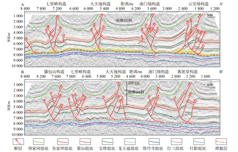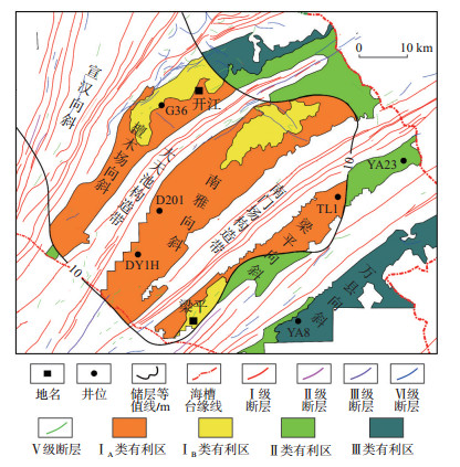 1 地质概况四川盆地属于扬子准地台的次级构造单元,盆地内发育川北低缓构造带、川中平缓构造带、川南低陡构造带、川东高陡构造带、川西低陡构造带、川西南低断褶构造带等6个构造区[13-14](图 1a)。南雅地区在构造上隶属于川东高陡褶皱带,属二级构造单元,构造位置稳定,整体发育NE—SW向构造,自北向南构造宽度逐渐减小,整体呈狭长状,褶皱强度较大,西侧以大天池构造带为界,东侧以南门场构造带为界,南部发育龙门潜伏构造,北部发育巫山坎潜伏构造[15](图 1b)。研究区发育典型的隔挡式褶皱带,区域上发育南雅向斜、檀木场向斜、宣汉向斜、梁平向斜、万县向斜等多个向斜构造,向斜内地层稳定,向斜两侧发育深大断层,多个典型井分布于各向斜中。其中南雅向斜核心位置部署的DY1H井、D201井为典型高产井,而其他向斜区域的G36,TL1,YA23,YA8等井产量均较低。