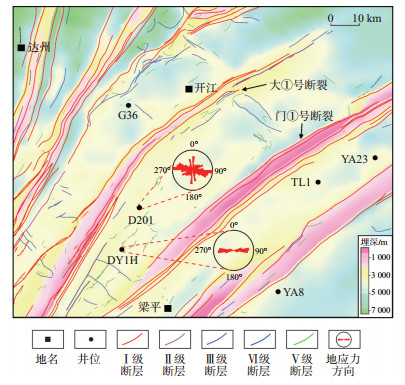 下载原图 图 3 四川盆地东部南雅地区断层分级及典型井地应力方向 Fig. 3 Fault classification and the stress direction of typical wells in Nanya area of eastern Sichuan Basin |