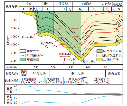 “开江—梁平”海槽是四川盆地东部南雅地区海相页岩形成的基础,受拉张应力形成的海槽为吴家坪组页岩提供了良好的生烃条件;深水陆棚相沉积环境是有机质富集的基础,加之丰富的有机质来源,促使高TOC页岩形成,有利于页岩气的形成和富集。构造作用贯穿吴家坪组页岩气生成的全过程,直接影响页岩的埋藏史,从而影响有机质的热成熟度和生烃过程。整个川东地区经历了加里东期基底形成、印支期陆内变形、燕山—喜山期强烈改造,形成了“隔挡式”褶皱带,研究区吴家坪组原始沉积经历了3期构造运动的改造,印支运动(T3)基底活化,形成NE向构造雏形;燕山运动(J3—K1)强烈挤压推覆,发育高陡背斜;喜山运动(E—Q)走滑叠加改造,断层体系复杂。构造运动导致地层发生抬升和沉降,直接影响吴家坪组页岩气的热演化程度,根据模拟吴家坪组页岩的埋藏史和热演化史可知[26],主要排烃期为侏罗纪(J1—J3),主要生气期为中侏罗世—早白垩世早期(J2—K1),Ro分别为0.8%~1.5% 和1.0%~1.8%,此阶段Ro为低—高成熟阶段。研究区向斜内构造较为稳定,处于陆内变形阶段,并未对页岩气的生成产生较大的影响,有利于页岩气形成和富集(图 4)。孔隙度在埋藏初期处于一个较高的状态,随着埋深增大以及构造作用的影响,孔隙度逐渐降低,而地层良好的封闭性使地层压力系数逐渐增高,因此,构造作用对吴家坪组烃源岩的形成有直接控制作用。