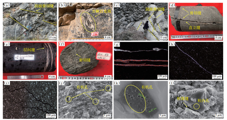 构造作用通过多期次、多类型的动力学过程,对页岩储层产生典型的物理-化学作用,既可能破坏原始储集性能,也可以通过特定机制形成有利储集空间,该影响具有明显的时空分异性。为深入了解构造作用对储层的改造机制,通过野外地质考察、岩心观察与描述、岩心薄片以及扫描电镜鉴定,对吴家坪组页岩裂缝及孔隙特征开展详细分析。在宏观野外剖面露头可见吴家坪组发育多条裂缝,裂缝倾角以高角度为主(倾角大于75°),垂直或近垂直于岩层,可见部分裂缝被方解石充填(图 5a—5c)。岩心上可观察到高角度的剪切缝和直立缝,同时可见大量被方解石充填的层间缝(图 5d—5f)。这些裂缝均经历了多期次构造挤压作用,是页岩在应力作用下发生脆性变形形成的,他们直接增加了孔隙空间,极大地提高了页岩的渗透性。