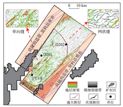 普通薄片镜下可见裂缝发育,大部分裂缝形态平直且被方解石充填(图 5g—5i),在扫描电镜下,可见明显有机质孔,孔径达226 nm(图 5k),同时可见部分粒间孔和粒缘缝以及部分溶蚀孔(图 5l)。在印支期的埋藏阶段,构造作用伴随深部热液活动或埋深增大,使吴家坪组页岩有机质热演化程度升高,高成熟阶段的有机质生烃和沥青化形成大量纳米级有机质孔隙,同时烃类生成导致孔隙流体压力升高,可能诱发超压裂缝,形成新的孔隙空间[27];到燕山—喜山期的陆内变形阶段,构造活动驱动热液流体(如富CO2或有机酸流体)沿断裂带运移,溶解页岩中方解石、长石等易溶矿物,形成次生溶蚀孔,尤其在断层附近发育明显[28]。在一定程度上,构造作用也抑制了页岩的储集性,在喜山期的强烈改造阶段,构造作用容易形成大型断层,如南雅向斜两侧通天Ⅰ级断层则破坏了页岩气藏的封闭性,导致气体逸散。构造作用驱动的热液活动也可能导致热液携带硅质或碳酸盐矿物,他们在裂缝中沉淀,部分堵塞孔隙,导致局部孔隙度降低[9, 29]。与此同时,构造应力分布不均导致页岩孔隙发育呈强非均质性,研究区两侧背斜因张性裂缝发育致使孔隙度高,而向斜区相对孔隙度较低。整体来看,DY1H井吴家坪组页岩平均孔隙度达到3.72%,其中吴三段页岩平均孔隙度达到4.47%,为优质储层段。从三维裂缝预测结果可知该地区以网状缝为主,斜坡部位发育单一方向缝,且单一方向裂缝走向与断层展布方向及构造走向基本一致(图 6)。这些缝网能有效改善页岩的孔隙度和渗透率,促进气体的运移和富集,强烈的构造应力会促进天然裂缝的发育,扩大孔隙喉道连通性,提升储集空间和游离气含量。因此,研究区页岩的储集受构造作用控制,构造作用并未造成核心区域储集性遭到破坏,反而微孔隙、网状缝的发育促进了页岩储集性的增加。