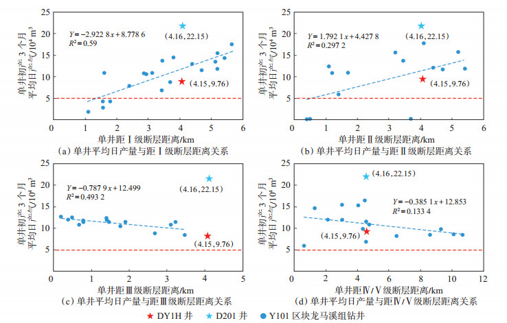 下载原图 图 8 单井初产3个月平均日产气与距断层距离关系 Fig. 8 Relationship between the average daily gas production of a single well in the first three months and the distance from the well to fault |
