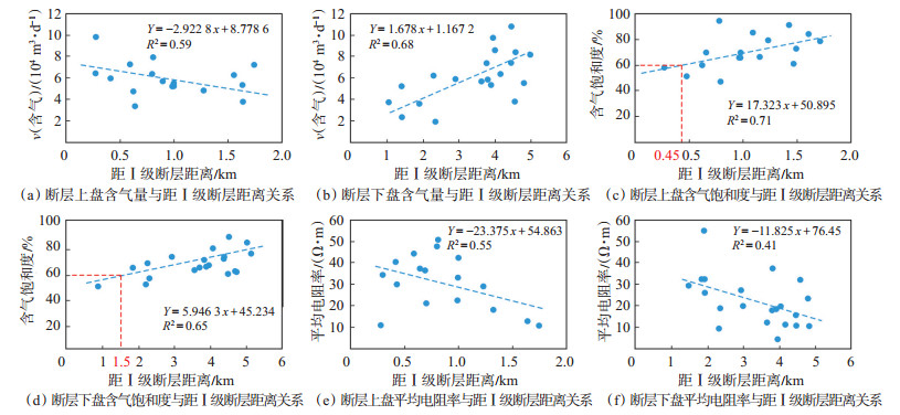 为更加清楚地了解Ⅰ级断层对页岩气的影响,对南雅地区各构造带距离断层5 km内老井进行含气量统计。整体上,受喜山期构造运动影响,南雅地区以北东向Ⅰ级断层为主,排除黄铁矿层的影响,统计距离区域Ⅰ级断层5 km内的评价井,分为断层上盘和断层下盘对各钻井含气性进行评价,并建立距Ⅰ级断层距离与含气量、含气饱和度以及平均电阻率的关系图(图 9)。从散点图来看,研究区钻井距Ⅰ级断层上盘距离与含气量呈一定的负相关关系,拟合系数R2仅为0.59;距Ⅰ级断层下盘距离与含气量呈正相关关系,拟合系数R2达到0.68;距Ⅰ级断层上、下盘距离与含气饱和度均呈正相关关系,拟合系数分别达到0.71和0.65,具有较强的相关性;而与平均电阻率均呈负相关关系,拟合系数分别为0.55和0.41。