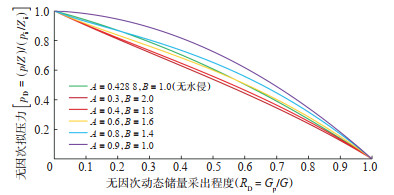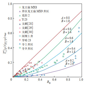 式(9)由矿场数据统计发现,中国11个异常高压有水气藏的数据点和理论线的关系如图 2所示。$A, B$ 值可以揭示不同的水侵方式:若气藏为早期水侵,则$A$ 值越大;若气藏为中后期水侵,则$B$ 值越大。不同气藏的水侵方式不同,故不同气藏的$A, B$值也不相同(图 2)。根据文献[3, 26-32]的矿场数据,中国11个异常高压有水气藏的$A$ 值为$0.3 \sim 0.9, B$ 值为$1 \sim 2$。值得注意的是,水侵主要发生在开发早期的气藏$A$ 值高于异常高压无水气藏$\bar{C}_{\mathrm{e}}(p) \Delta p+\omega$ 与$G_{\mathrm{p}} / G$ 线性拟合关系中斜率$\lambda$ 的值为0.4288(图 3),$B$ 值近似于1,如牙哈23气藏的$A, B$ 值分别为0.825和1。