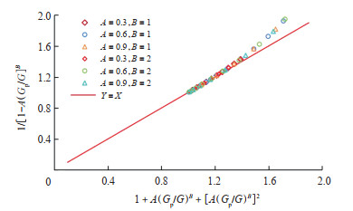 因$G_{\mathrm{p}} / G < 1$,在$A$ 值为$0.3 \sim 0.9, B$ 值为$1 \sim 2$的条件下,由图 4可看出,式(12)的值主要由前2项贡献。