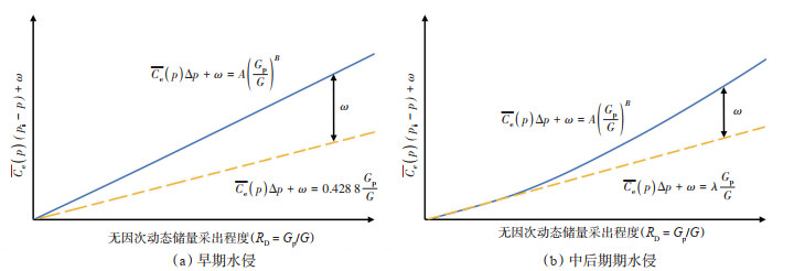采用图解方法可确定气藏不同水侵方式的$\omega$ 值:若气藏为早期水侵,则$\bar{C}_{\mathrm{e}}(p) \Delta p+\omega$ 与$G_{\mathrm{p}} / G$幂指函数拟合关系线位于异常高压无水气藏$\bar{C}_{\mathrm{e}}(p) \Delta p+\omega=0.4288\left(G_{\mathrm{p}} / G\right)$ 线性拟合关系线的上方(图 6a);若气藏为中后期水侵,作$\bar{C}_{\mathrm{e}}(p) \Delta p+\omega$与$G_{\mathrm{p}} / G$ 幂指函数拟合关系线的切线,切线的线性方程可近似代表早期无水侵阶段(图 6b)。通过计算2条拟合线的差值,计算$\omega$ 参数。