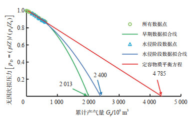 式中:$G_{\mathrm{p}}$ 为累积产气量,$10^{8} \mathrm{~m}^{3}; B_{\mathrm{g}}$ 为$p$ 压力下的气体体积系数;$G$ 为动态储量,$10^{8} \mathrm{~m}^{3}; B_{\mathrm{gi}}$ 为原始气体体积系数;$p$ 为某开发时间的地层压力,$\mathrm{MPa}; p_{\mathrm{i}}$ 为原始地层压力,$\mathrm{MPa}; W_{\mathrm{e}}$ 为水侵量,$10^{4} \mathrm{~m}^{3}; W_{\mathrm{p}}$ 为累积产水量,$10^{4} \mathrm{~m}^{3}; ~ B_{\mathrm{w}}$ 为地层水体积系数,一般取1.0。