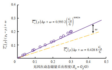 $\bar{C}_{\mathrm{e}}(p) \Delta p$ 和$\omega$ 分别为气藏岩石骨架、流体压缩与水体侵入的综合能量。令$R_{\mathrm{D}}=G_{\mathrm{p}} / G$,定义为动态储量采出程度。假设$\bar{C}_{\mathrm{e}}(p) \Delta p+\omega$ 与$G_{\mathrm{p}} / G$ 符合幂指函数关系,则有