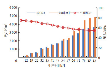 分别利用式(20)和式(22)计算国内5个已开发的异常高压有水气藏(井)的动态储量和水侵量,与调研文献中的动态储量数据和水侵量均较为一致(表 2),由此说明式(20)和式(22)计算的动态储量和水侵量是可靠的。