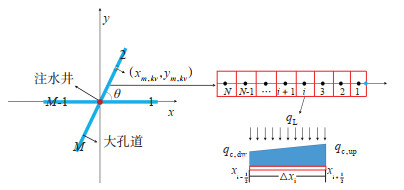 如图 1所示,直井周围发育M条大孔道,将大孔道近似处理为矩形高渗区域。由于大孔道内不均匀的流量分布,考虑高速非达西渗流后,大孔道的导流能力沿大孔道是变化的。采用离散方法对大孔道进行处理,每条大孔道被分割成N个离散段。结合其对称性,针对i-th大孔道段,忽略大孔道内的弹性变化量,结合无因次量和Laplace变换,可得拉式空间中大孔道渗流模型为[22-23]