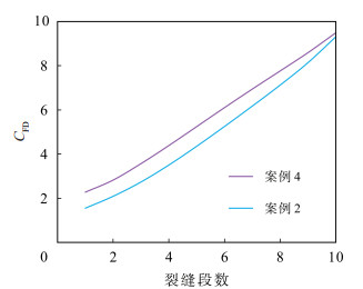 设计4个案例对大孔道数量的影响进行分析,案例1:发育2条大孔道,不考虑高速非达西渗流;案例2:发育2条大孔道,考虑高速非达西渗流;案例3:发育4条大孔道,不考虑高速非达西渗流;案例4:发育4条大孔道,考虑高速非达西渗流(图 9)。由图 9可看出,大孔道数量增加,注水井流动能力增强,双线性流、线性流及大孔道干扰段曲线明显下降,对比案例1和案例3,当tD=0.001时,随着大孔道由2条变为4条,无因次压力由0.17下降至0.12,下降了29.4%。同时,随着大孔道增多,高速非达西渗流的影响程度有所减小,当tD=0.001时,随着大孔道由2条增加至4条,高速非达西渗流引起的压力增幅由89% 下降至55%,这是因为大孔道增多,每条大孔道内流体流量减小,高速非达西渗流作用减弱,由图 10可看出,4条大孔道情况下高速非达西渗流导致的导流能力伤害程度相对2条大孔道更小,大孔道内导流能力更大。