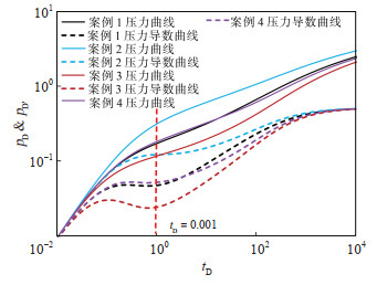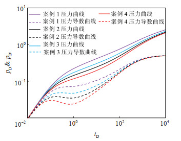 大孔道导流能力是大孔道评价的关键参数,设计4个案例对大孔道导流能力的影响进行分析,案例1∶CFD=5,考虑高速非达西渗流;案例2∶CFD=5,不考虑高速非达西渗流;案例3∶CFD=10,考虑高速非达西渗流;案例4∶CFD=10,不考虑高速非达西渗流。由图 11可看出,随着大孔道导流能力增大,注水井流动阻力减小,考虑与不考虑高速非达西渗流情况下,双线性流、线性流及大孔道干扰段压力及压力导数曲线均向下明显移动。