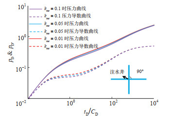 下载原图 图 13 高速非达西最小渗透率比值对压力动态的影响 Fig. 13 Influence of minimum permeability ratio of high-velocity non-Darcy on pressure transient |