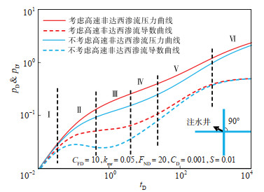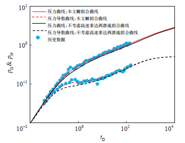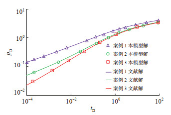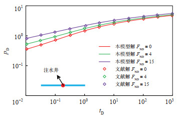 大孔道内的高流速可产生高速非达西渗流,影响注水井的生产动态。建立发育2条对称大孔道的模型,初始无因次导流能力CFD = 5,设置kmr = 0,将本文模型简化为Forchheimer模型,与Guppy文献[25]中压力动态解进行对比验证[25]。由图 4可看出,考虑高速非达西渗流,本文模型与Guppy模型[25]的压力动态计算结果一致性好,说明本文压力动态求解模型适用于存在高速非达西渗流的大孔道的压力动态求解。