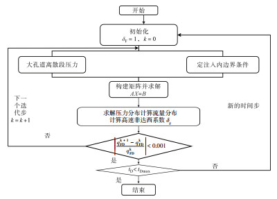 当考虑高速非达西渗流时,大孔道的导流能力$\left(C_{\mathrm{FD}}\right)$ 是大孔道内流体流量($q_{\mathrm{cD}}$)的函数,上述模型为非线性模型,可引入迭代法进行求解,具体求解步骤为:(1)输人计算基本参数;(2)开始新的时间步,设置迭代步$k=0$,并将各离散段高速非达西系数$\delta_{\mathrm{F}}$ 初始化为1;(3)进人迭代步中,根据各个离散段的高速非达西系数$\delta_{\mathrm{F}}$,计算各离散段的导流能力,对未知量进行求解;(4)计算各大孔道各个离散段内的压力及流量分布,更新各个离散段的高速非达西系数$\delta_{\mathrm{F}}$;(5)对2个迭代步之间的误差进行判断,如果满足精度要求则进人下一时间步,如果不满足要求,令$k=k+1$,执行步骤3及步骤4直至精度满足要求进人下一时间步;(6)开始一个新的时间步,重复执行步骤2至步骤5直至所有时间步计算完成(图 2)。