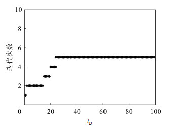 大孔道内高速非达西渗流主要对早期阶段的压力解产生影响,考虑高速非达西渗流后,早期压力及压力导数曲线均明显向上移动,当tD = 0.001时,考虑高速非达西渗流无因次压力增加了55%,这是因为高速非达西渗流产生额外的生产压差,大孔道内渗流阻力增大,考虑大孔道内高速非达西渗流可实现更加准确的大孔道参数解释。考虑高速非达西渗流后,近井端大孔道导流能力出现明显下降;同时可以发现考虑高速非达西渗流后,近井端大孔道无因次压力明显增大,无因次压力沿大孔道下降更快(图 6,图 7)。设置100个时间步进行模拟,442次迭代完成计算,表明迭代计算是处理高速非达西渗流的必要方法(图 8)。