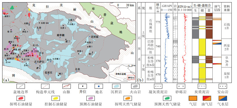 1 地质概况准东地区位于准噶尔盆地东部,北以克拉美丽山为界,南邻博格达山,油气资源丰富,区内已发现多个油气田,储层主要位于石炭系,岩性主要为安山岩、玄武岩、火山角砾岩和发育裂缝的凝灰岩。石炭系火山岩发育广泛,而沉积岩呈条带状和点状分布于研究区中部和西南部(图 1a)[19]。阜康断裂带控制着石炭系的沉积,自下而上发育下石炭统松喀尔苏组(C1s)和上石炭统巴塔玛依内山组(C2b)、石钱滩组(C2sh)。松喀尔苏组可分为两段,自下而上为a段(C1sa),b段(C1sb),主要发育泥岩、中酸性火山熔岩和凝灰岩沉积[20]。巴塔玛依内山组上段以酸性火山岩为主,含部分中性安山岩;下段主要为基性火山岩(玄武岩),而安山岩和流纹岩较少。石钱滩组上段主要发育砂砾岩与泥岩沉积;中段主要为泥岩与细砂岩互层;下段主要为砂砾岩与砂泥岩互层(图 1b)。
