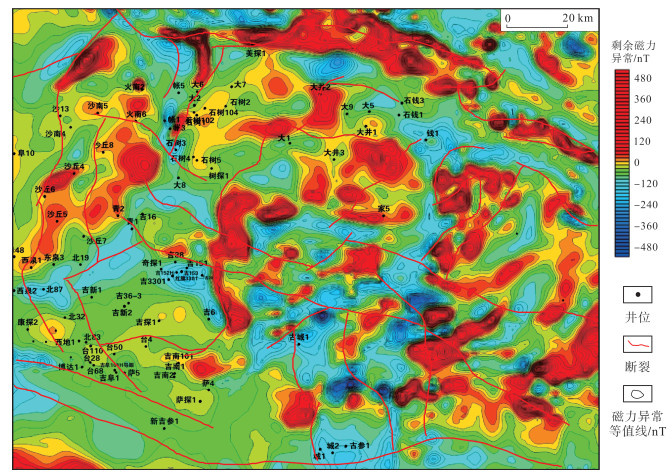 “裂隙式”火山机构依托断裂发育是导致火山活动期间所沉积的火山角砾岩沿断裂走向分布的主要原因。由于火山活动期和间歇期的循环,在火山通道处出现了多种岩石(火山角砾岩、凝灰岩和火山沉积岩)叠置分布的现象,这也是平面分布图中出现多岩相互相重叠的主要原因。溢流相玄武岩、安山岩一般表现为正磁力异常,而爆发相凝灰岩、火山角砾岩及沉积相碎屑岩等弱磁岩性体大多表现为负磁力异常。准东地区石炭系的剩余磁力异常图(图 10)显示,在石炭系顶部钻遇溢流相安山岩、玄武岩等强磁岩性体的井基本位于正磁力异常区域,而钻遇爆发相凝灰岩、火山角砾岩及火山沉积相碎屑岩等弱磁岩性体的井大多位于负磁力异常区域。爆发相主要分布在研究区中部,而溢流相主要分布在东部和北部的大部分地区,且在平面上呈线性或条带状展布,与断裂展布具有较好的匹配关系,具有“裂隙式”火山机构喷发的特点。因此,可以认为研究区石炭系以“裂隙式”火山喷发机制为主。