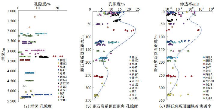 4.1 风化淋滤作用风化淋滤作用对火山岩储层的改造作用非常明显[25-27],通过风化淋滤将火山岩储层中原本相互独立的储集空间进行了有效沟通,形成了一个相互连通、物性明显变好的风化壳储层[28]。对研究区石炭系已完钻井的物性资料进行分析可知,火山岩储层孔隙度与埋深无明显相关关系,孔隙度随埋深呈跳跃性变化(图 11a),与距石炭系顶界面距离呈明显的正相关关系,距石炭系顶界面越近时,储层孔隙度越高,孔隙度相对高值都分布于距石炭系顶界面150 m以内(图 11b)。此外,储层渗透率的相对高值也位于距石炭系顶界面150 m以内(图 11c)。因此,可以认为研究区石炭系火山岩储层离石炭系顶界面越近,物性越好。