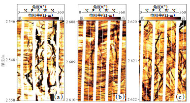 下载原图 图 12 准东地区北三台凸起西泉2井石炭系火山岩成像测井裂缝特征 (a)发育多条高角度裂缝和直劈缝;(b)裂缝不发育,部分裂缝被方解石充填;(c)网状裂缝较发育,个别裂缝被方解石充填。 Fig. 12 Fracture characteristics of imaging logging of Carboniferous volcanic rocks in well Xiquan-2, Beisantai uplift, eastern Junggar Basin |
