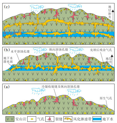 下载原图 图 13 准东地区石炭系火山岩风化淋滤作用模式 (a)火山岩形成初期,熔岩顶、底气孔发育,远离潜水面地表溶蚀孔隙,纵向溶蚀为主;(b)火山岩形成早期,潜水面附近流体影响,形成水平孔隙;(c)火山岩形成中期,地层抬升,潜水面发生变化,形成新的孔隙。 Fig. 13 Weathering and leaching models of Carboniferous volcanic rocks in the eastern Junggar Basin |