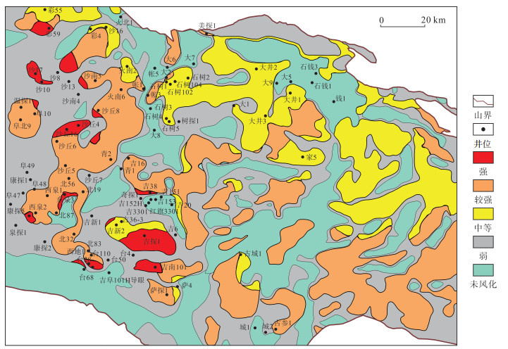 下载原图 图 14 准东地区石炭系火山岩风化强度平面分布特征 Fig. 14 Planar distribution characteristics of weathering intensity of Carboniferous volcanic rocks in the eastern Junggar Basin |