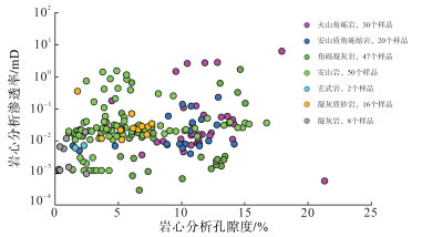 岩性与岩相在一定程度上可以直接影响火山岩有利储层的发育程度,不同岩相组合的储层的脆性、裂缝发育程度及抗风化淋滤能力等方面都存在较大差异[30]。对准东地区石炭系火山岩储层岩性与物性关系进行统计分析,结果(图 15)显示:含角砾成分的火山岩储层物性较好,凝灰岩储层物性最差[33],其中火山角砾岩平均孔隙度为12.9%,安山质角砾熔岩次之,平均孔隙度为9.8%,角砾凝灰岩平均孔隙度为7.8%;玄武岩平均孔隙度为6.1%,凝灰质砂岩平均孔隙度为5.5%,安山岩平均孔隙度为5.0%,裂缝不发育的凝灰岩平均孔隙度仅为1.2%。火山角砾岩及少量角砾凝灰岩为高孔、高渗岩相组合,角砾熔岩、角砾凝灰岩和安山岩为高孔、低渗岩相组合,角砾凝灰岩、安山岩和安山质角砾熔岩为中孔、低渗岩相组合,其余岩相组合表现为低孔、低渗特征。