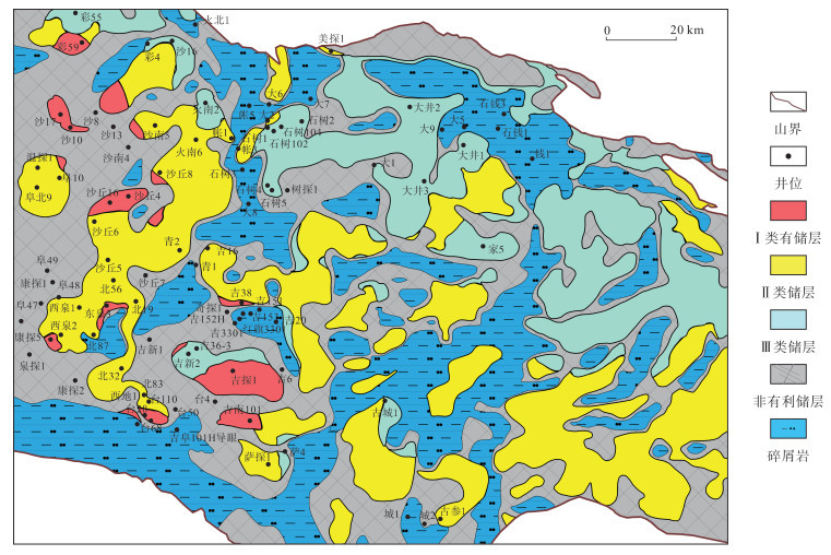 将准东地区石炭系各井的测井参数代入上述模型,并根据石炭系顶部有利火山岩储层判断标准(表 3),可以确定不同区域有利储层的类别,进而绘制有利储层的平面分布图。结果(图 16)显示:石炭系火山岩储层可划分为3类,Ⅰ类储层零星分布于区域西部,主要位于古地貌构造高部位和斜坡带,岩相以近火山口爆发相火山角砾岩,溢流相安山岩及玄武岩为主,该类储层在沉积期更易产生裂缝,在风化淋滤等外力作用下,大气淡水沿断裂和微裂缝向下延伸,发生溶蚀,以纵向溶蚀为主,储层物性变好,油气资源丰富。Ⅱ类储层主要分布于研究区西北部、中部和东南部,而Ⅲ类储层在东北部与东部连片分布。这3类储层的构造位置依次降低,岩性变化却并不大,主要原因是风化淋滤等外力作用的不同,导致Ⅱ类和Ⅲ类储层的物性较差。此外,远火山口爆发相凝灰岩致密,受风化淋滤作用影响较小,溶蚀强度较低,沉积区主要形成Ⅱ和Ⅲ类储层。