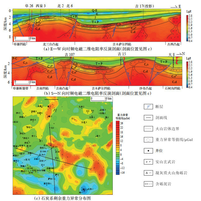 2 构造特征对准东地区石炭系进行重力异常分析,采用时频电磁法通过2条互相交叉的测线绘制南北向及东西向的二维电阻率反演剖面(图 2)。东西向测线自西向东依次探测了阜康凹陷、北三台凸起、吉木萨尔凹陷、古西凸起的石炭系(图 2a),凸起与凹陷相间,主要受海西运动的构造挤压应力发育了多条大型断裂带。其中吉木萨尔凹陷西部受控于与北三台凸起之间发育的逆冲断裂,北三台凸起石炭系隆升,顶界面发生剥蚀,吉木萨尔凹陷东部受控于其与古西凸起之间发育的走滑断裂,整体上呈楔状构造。古城凹陷西部受与古西凸起之间发育的逆冲断裂控制,古西凸起东部石炭系隆升剥蚀,而古城凹陷东部被与古东凸起之间发育的逆冲断裂控制,古西凸起西部石炭系隆升剥蚀。南北向测线自南向北依次探测了阜康断裂带、吉南凹陷、吉南凸起、吉木萨尔凹陷、沙奇凸起及石树沟凹陷的石炭系(图 2b)。阜康断裂带多为逆冲断裂,不同沉积期地层发生了不同程度的隆升。吉南凹陷南临阜康断裂带,其北部被与吉南凸起之间发育的逆冲断裂控制,导致吉南凸起石炭系隆升。吉木萨尔凹陷南、北部分别被与吉南凸起、沙奇凸起之间发育的2条逆冲断裂控制,呈楔状构造。石树沟凹陷南部被与沙奇凸起之间发育的逆冲断裂控制,使得沙奇凸起北部石炭系隆升剥蚀。整体而言,准东地区石炭系发育多条逆冲断裂,整体呈凸起-凹陷断裂相接的构造格局,凸起所在位置多发生剥蚀现象。